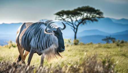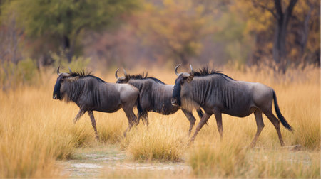 wildebeest in the grasslands of the game reserve in Southern Africa, generated by AI. High quality photo