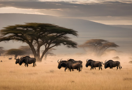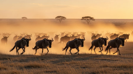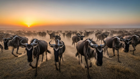 This captivating photo depicts a herd of wildebeest moving across the savannah during a warm sunset, highlighting the harmonious relationship between wildlife and nature.