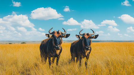 Generative AI Image of Two Wildebeests in the Vast Savanna at Bright Sky Wallpaper