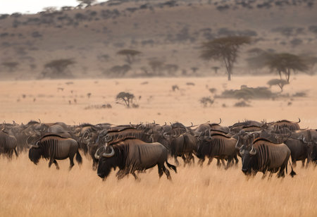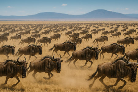 Majestic wildebeest migration across serengeti plains captured in motion.