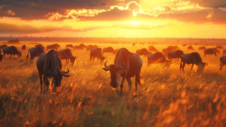 A peaceful herd of wildebeests grazing on the grasslands highlighted by the warm hues of the setting sun