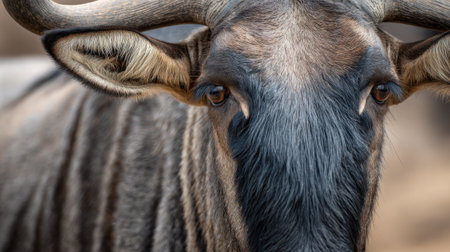 This detailed portrait of a wildebeest showcases its majestic features against a soft background, emphasizing the animal's beauty and wild character in nature.