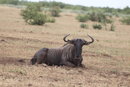 A majestic wildebeest lies down on the dry, dusty ground of the African savanna, with acacia trees in the background.