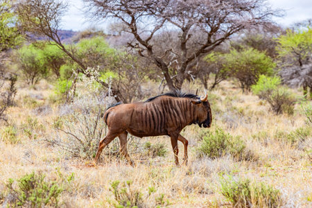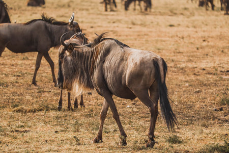 Blue wildebeest (Connochaetes taurinus) calmly walking in dry landscape in evening sun.