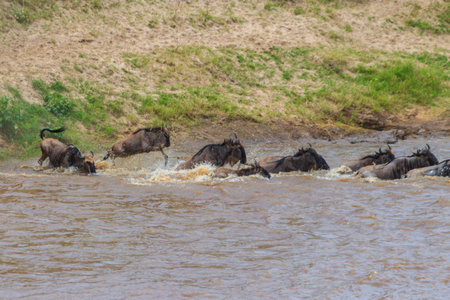 Wildebeest crossing the Mara river in Serengeti national park, Tanzania. Great migration