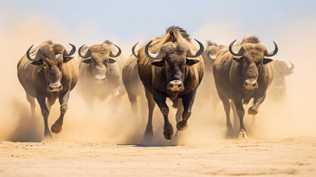 A dramatic scene of a large herd of wildebeest running across the savanna kicking up a cloud of dust in their wake The animals are moving with speed and power captured in a panoramic