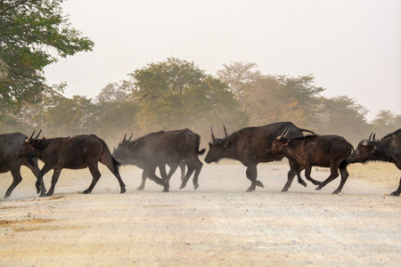 Herd of buffalos running across dusty road in Chobe National Park, Botswana, Africa