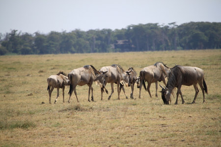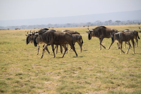Group of blue wildebeest, Connochaetes taurinus, in Amboseli National Park in Kenya.