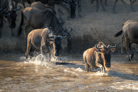 Wildebeests are crossing Mara river. Great Migration. Kenya. Tanzania.