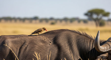 Beautiful wide shot of the African savanna with tall grass, vast landscape, animals in the distance, blue sky with clouds, cinematic, natural lighting, professional color grading, soft shadows, low contrast, clean sharp focus, in the style of National Geographic. --ar 3:2 --v 6.1 Job ID: ccf31a97-8c39-4008-ba2e-16e0c6942f6f
