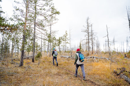 Two people trekking uphill on a forest path, a guy and a girl traveling together through a wild forest, hiking in the mountains. High quality photo