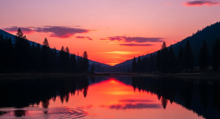 a stunning sunset over a calm lake reflecting the vibrant colors of the sky and the trees
