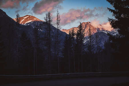 Scenic mountains at sunset time. There are pink fluffy clouds on the sky.