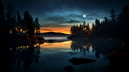 Beautiful night landscape with lake and forest. 3d rendering.