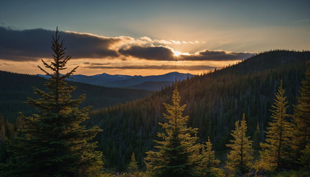Sunset in the mountains with silhouettes of coniferous trees
