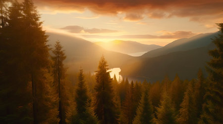 Sunset in the mountains with coniferous trees and a lake