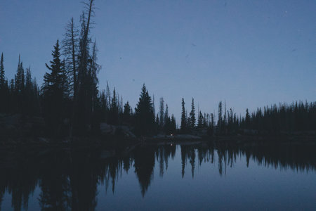 Silhouetted pine trees stand against a dark blue dusk sky illuminated by a warm orange glow on the horizon.