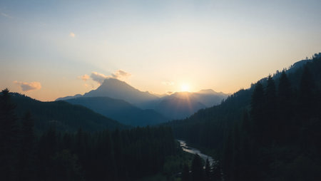 Sunset in the mountains. Mountain landscape with forest and river.