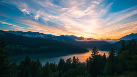 A breathtaking sunset over a still mountain lake, with the reflection of the colorful clouds in the water.