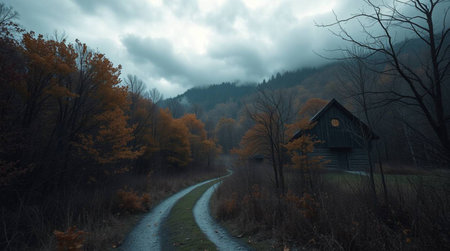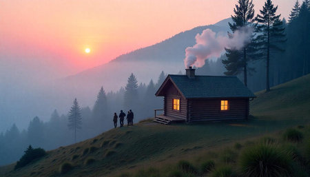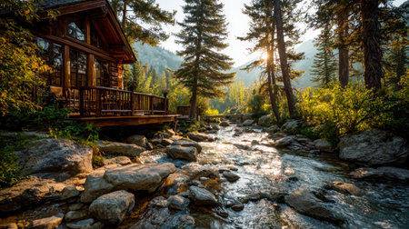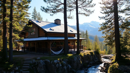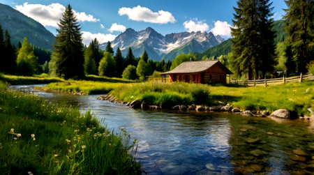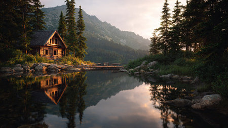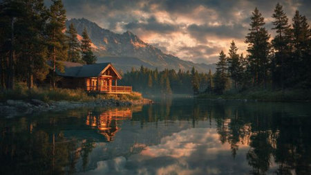 Majestic mountain cabin surrounded by lush meadows and forests at sunset a tranquil retreat
