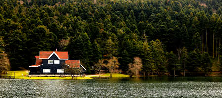 A panoramic shot of a wooden house on a lake surrounded by trees