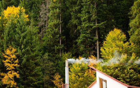 Autumn background . Mountain area with rusty fir tree . Chalet with smoking chimney .
