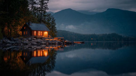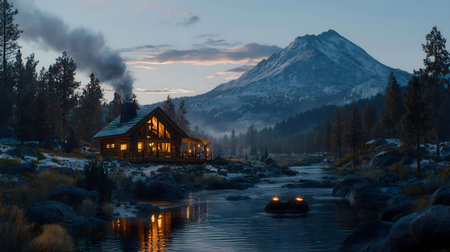 A cozy cabin nestled beside a tranquil river, with a majestic snow-capped mountain as a backdrop. Evening serenity.