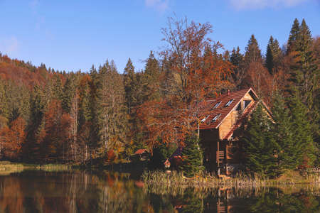 A wooden cabin in the autumn forest on Tara mountain in Serbia.