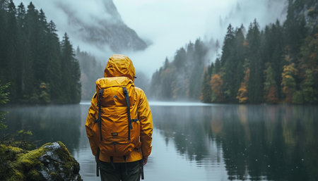 Person in hat and yellow jacket standing misty forest