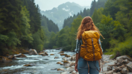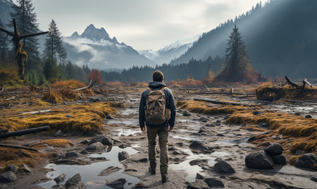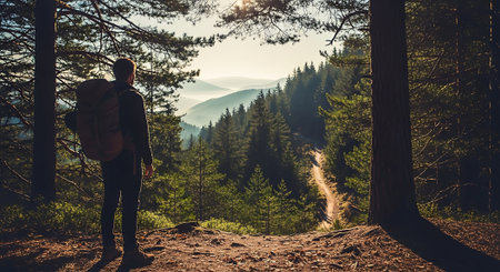 person, hiking through nature with backpack in view, created with generative ai