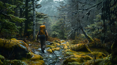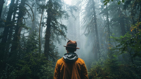 A lone hiker navigates a misty forest trail, surrounded by lush greenery and towering trees, embodying a sense of adventure and tranquility in nature.