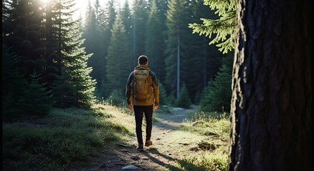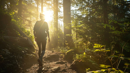 A person walking along a forest trail, with sunlight filtering through the trees generative ai