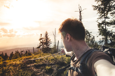 Young man tourist taking a selfie and pointing at a fallen tree on a background of mountains and dramatic sky at sunset sun