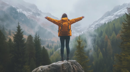 An adventurer in a bright yellow jacket stands with arms wide open, facing the misty mountainous landscape.