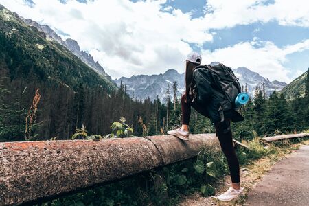 Woman traveler with backpack standing on the concret fence with one leg and enjoying amazing view of mountains