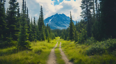 A mountain forest with tall pines and a winding trail, perfect for hiking and exploring nature's beauty