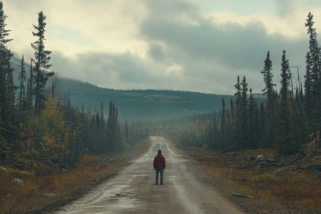 A person stands on a secluded dirt road, flanked by dense trees and distant mountains under a cloudy sky. The atmosphere feels serene yet isolated, creating a contemplative moment.