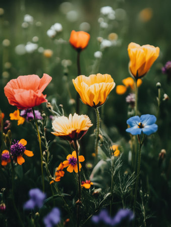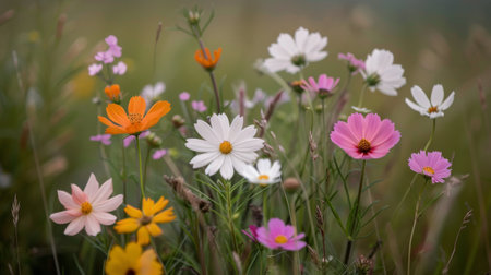 Vibrant wildflowers of various colors and shapes flourish in a sunny meadow, showing the beauty of spring. The delicate petals create a harmonious blend of orange, white, pink, and purple against lush green foliage.