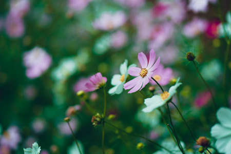 Close up of cosmeas on blurry background. Beautiful decorative flowers with bright buds. Concept of nature background
