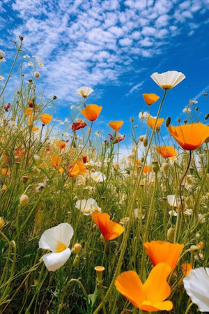 A colorful meadow filled with blooming wildflowers, showing various hues of daisies and poppies under a bright blue sky. The scene captures the beauty of nature in springtime.