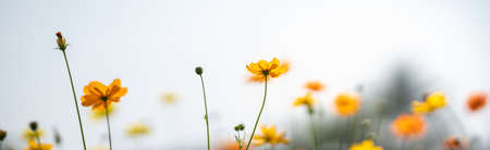 Closeup of yellow Cosmos flower with white sky as background under sunlight using as background natural flora landscape, ecology cover page concept.
