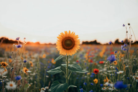 A lone sunflower stands tall in a vibrant field of wildflowers, bathed in the warm glow of the setting sun. The scene evokes a feeling of peace and tranquility.