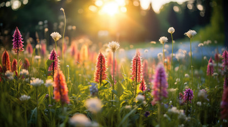 A wildflower meadow spring flower colorful nature field blossom garden sunrise wildflower meadow with colorful blossom flower field nature garden beauty in soft sunrise light