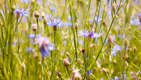 Blue wildflowers, cornflowers, on a green meadow in summer, in the sun. Selective focus. Bokeh. Copy space