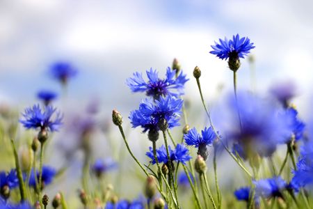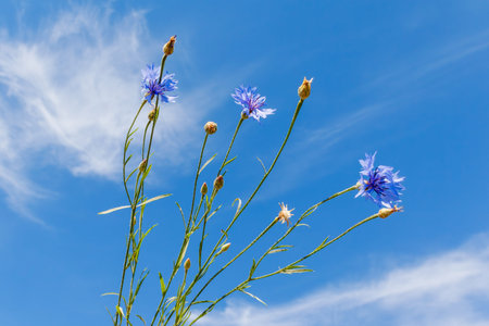 Blue cornflower (Centaurea cyanus) blooming against a bright blue sky with white clouds. Nature photography capturing delicate wildflowers in a summer meadow