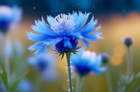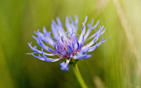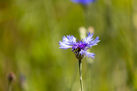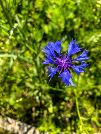 Bright blue cornflower Centaurea cyanus in full bloom on a green meadow in sunny weather. Close-up of single wildflower with blurred natural background. Botanical summer wild flora in nature