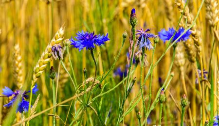 Vintage photo of cornflowers blooming on corn field. Nature background.