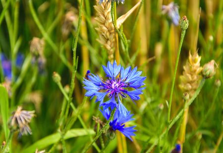 Cornflowers. Field plants on a sunny day in June. Close-up of a flower, blurred background.