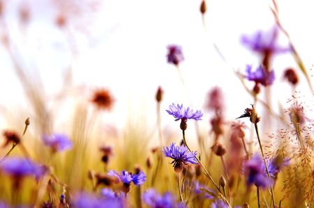 Summer landscape with wildflowers cornflowers and purple lupine in the rays of the sun.