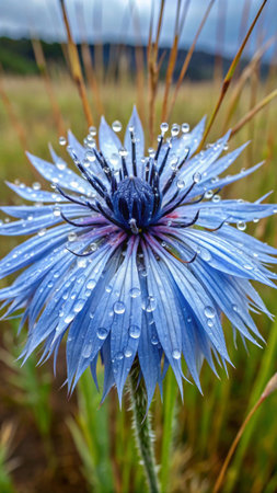 Blue flower is standing in a green field. The flower is the main focus of the image, and it is the most vibrant and beautiful part of the scene. Wallpapers vertical. Background vertical.
